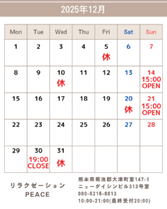 #リラクゼーション#リラクゼーションマッサージ#マッサージ#もみほぐし#ボディケア#ボディケアマッサージ#整体#リラク#肩こり#肩甲骨#首#腰痛#頭痛#慢性疲労#疲労回復#むくみ#フットケア#オイルマッサージ#ヘッドマッサージ#スポーツケア#大津町#肥後大津駅#菊陽町#光の森#阿蘇#プライベートサロン#個室